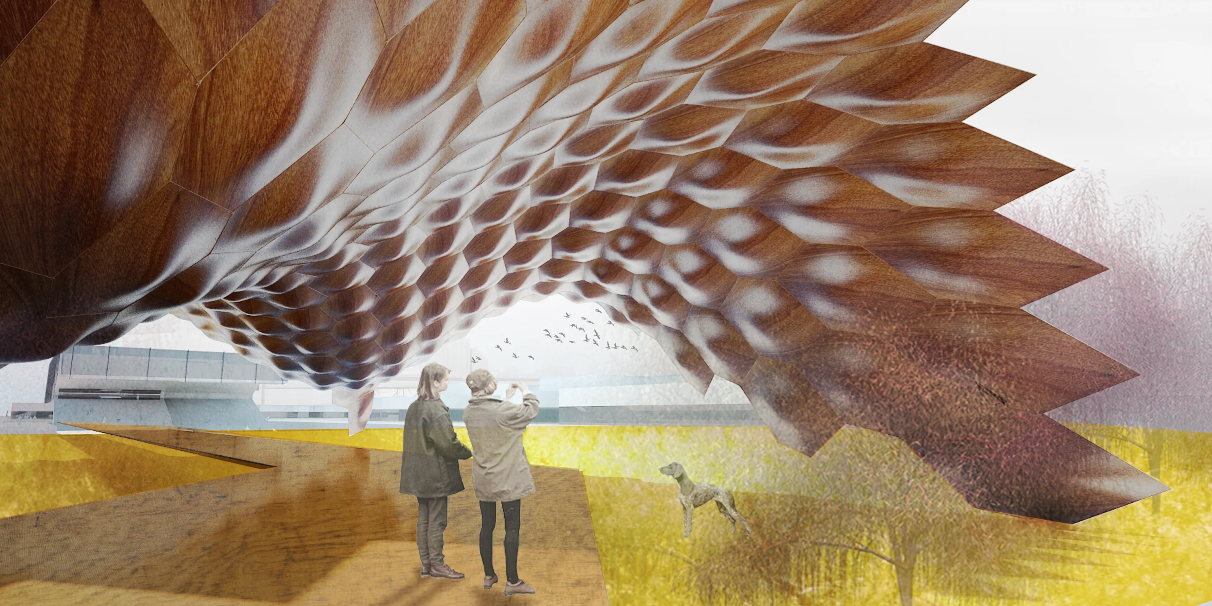 A building devoted to freshwater research contains a public loop inside that helps visitors learn about the ongoing changes occurring in the great lakes. Its location on the edge of the new land creates physical connections with the water. Insightful in its urban proposition, the project offers a way to achieve both a hydrological separation and green, connective urban density. A building divide two parts which is public band [for visitors] and research core box [for researcher]. Visitors are able to observe research lab along public loop. And, it connects between context and architecture through band